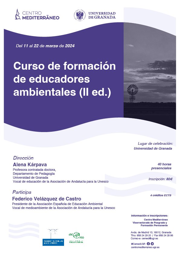 23 de abril de 2025Curso de Formación de Educadores Ambientales (II ed.) en GranadaCurso de formación de educadores ambientales (II ed.) en Granada del 11 al 22 de marzo de 2024. Inscripción 80€. 40 horas presenciales. 4 créditos ECTS. Descargar pdf de curso de formación de Educadores Ambientales (II ed.) en Granada en 2024